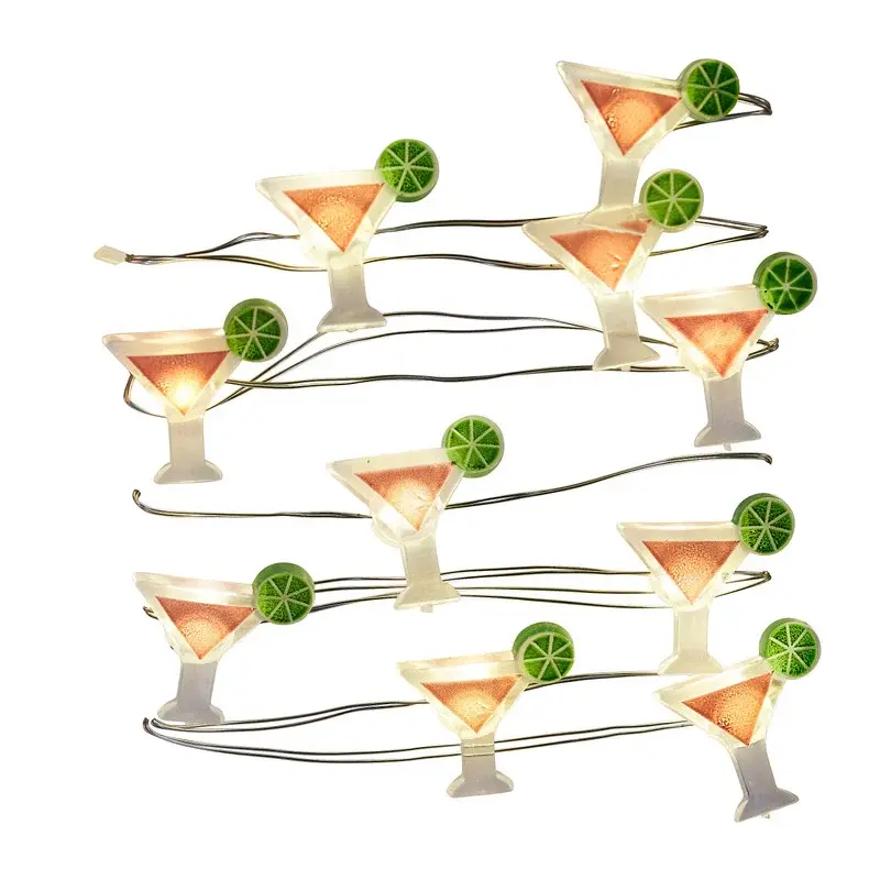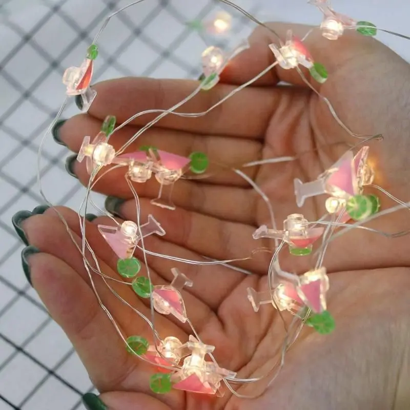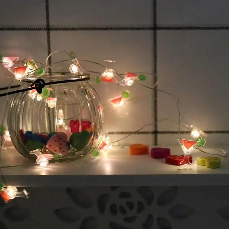 Descripción Tira de luz con mini cocktails de 1 metro de largo aproximadamente.Funciona con 2 pilas AA. No incluye las pilas.